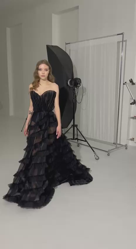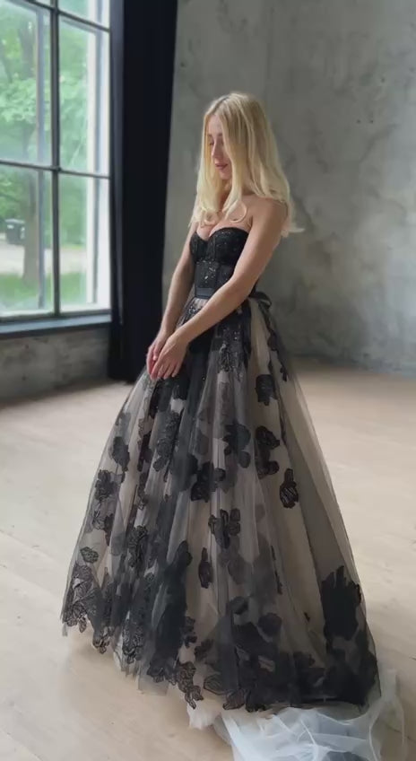 Black Floral Corset Wedding Dress with Embroidered Ruffled Train