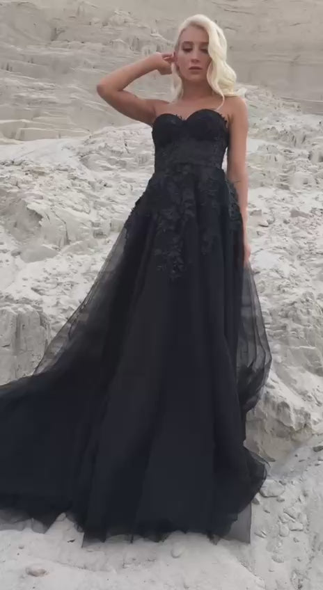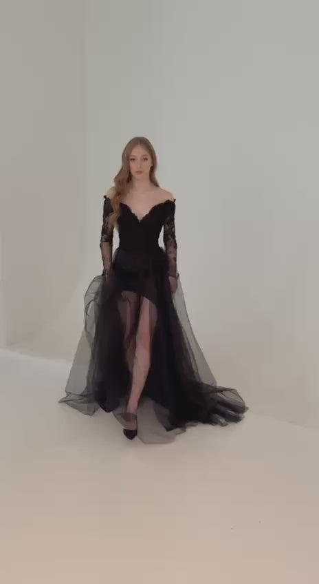 Black Corset Wedding Dress with Lace-Adorned Mesh Skirt